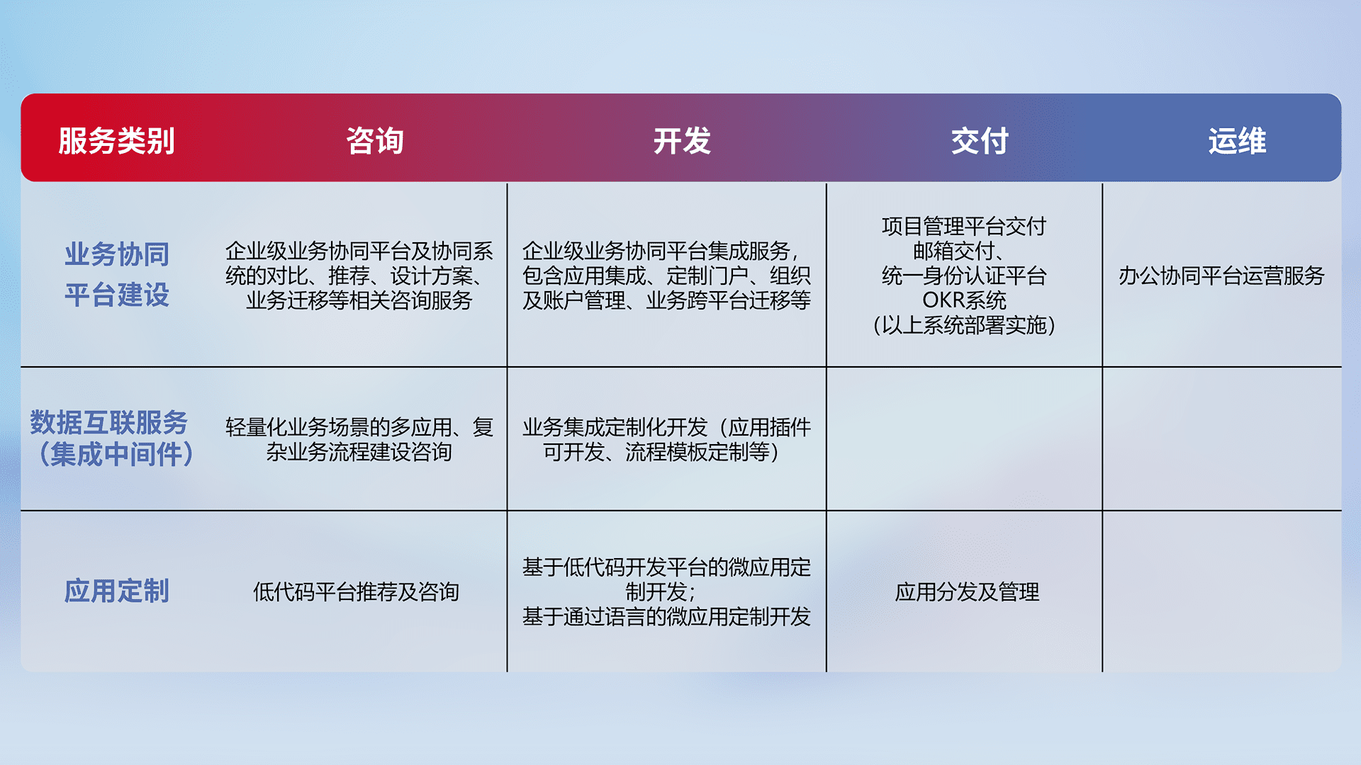 针对钉钉、、企微、、、IDaas等平台级产品提供产品的规划、、、方案、、交付、、定制化开发等服务,,实现如统一协同办公、、智能客户服务、、混合会议管理、、智能数据查询、、等业务场景,,,实现数字化转型。。